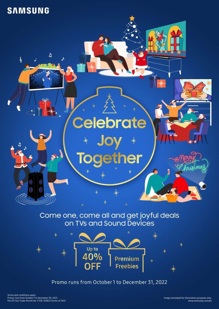Up to a 40% discount and exciting freebies await Samsung shoppers on home entertainment devices, such as Soundbars, projectors, and premium TVs. This special holiday promo kicks off on October 1 and will run until December 31, 2022 at authorized Samsung dealers nationwide and on Samsung.com.